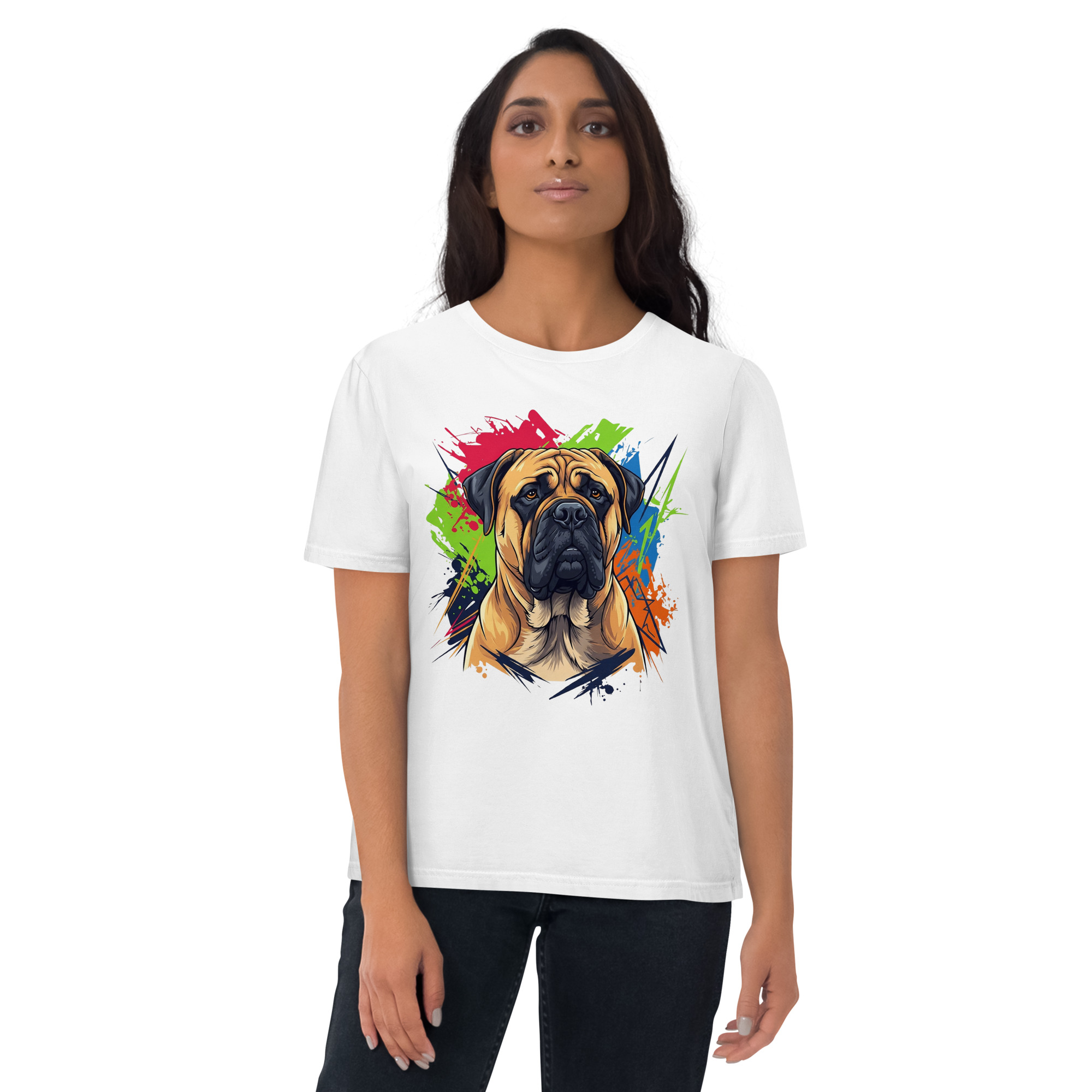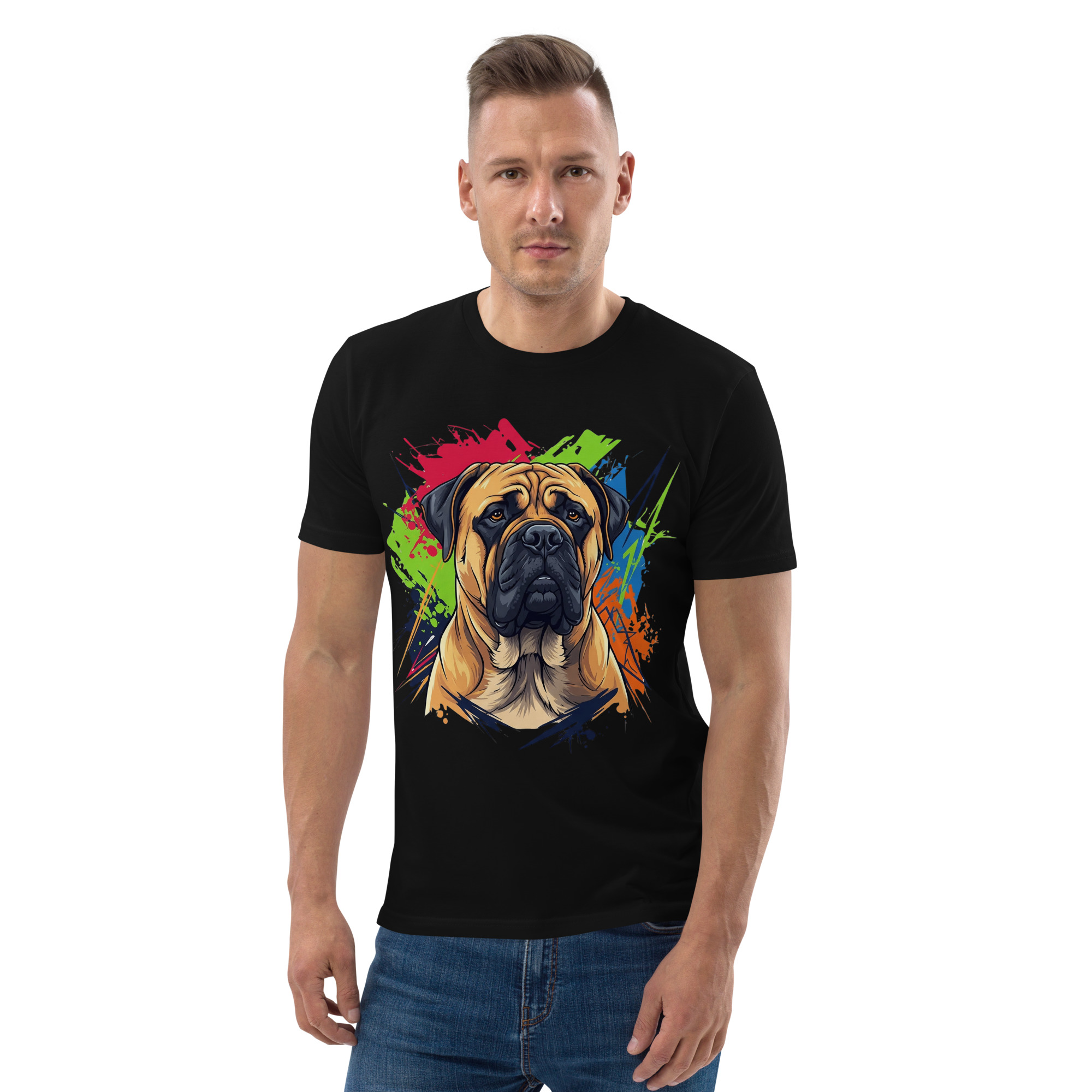 Lleva contigo el espíritu de un gigante gentil. Esta camiseta de algodón orgánico de alta calidad presenta un diseño exclusivo de Bullmastiff, combinando comodidad, estilo y nuestro compromiso con el planeta. Perfecta para honrar a un compañero fiel.