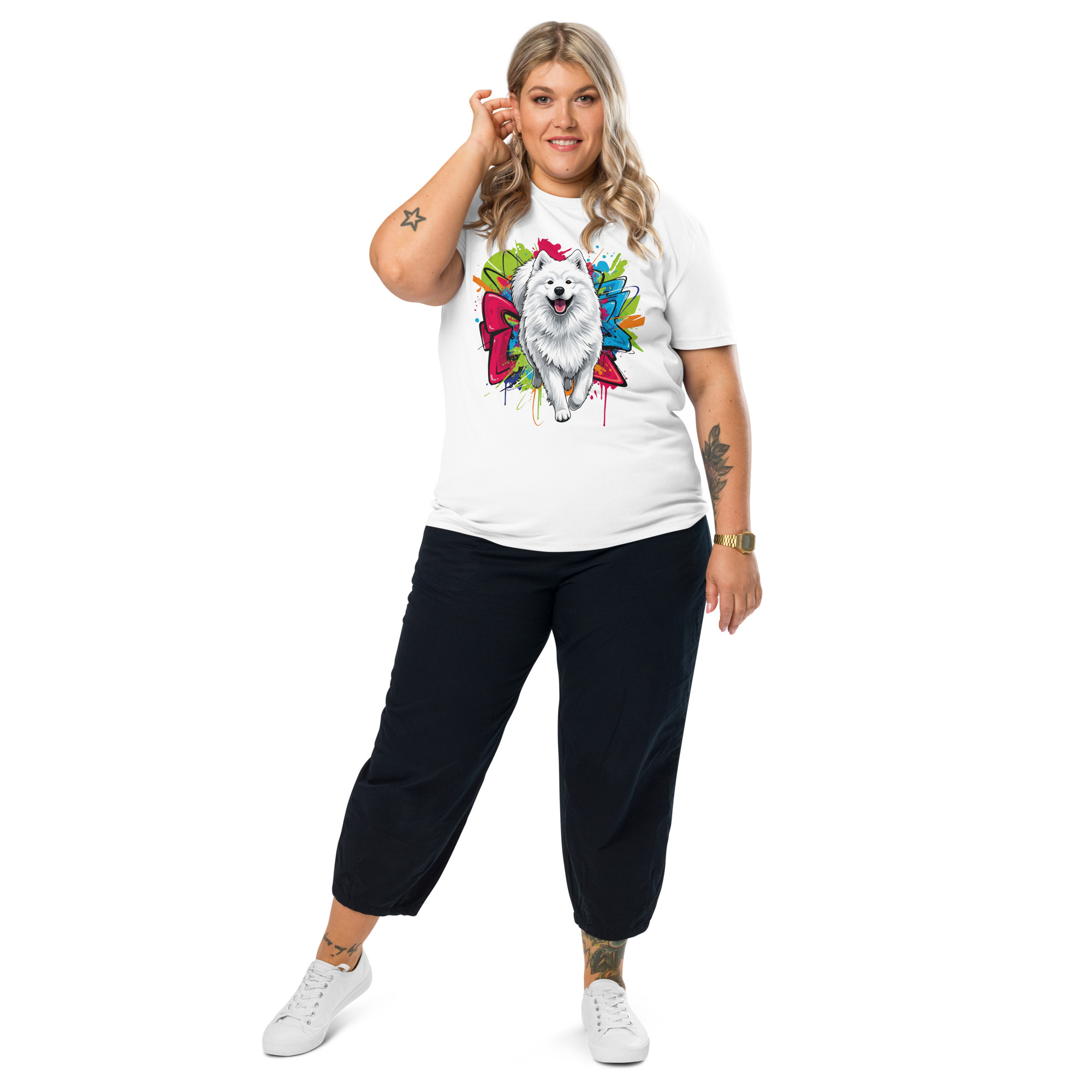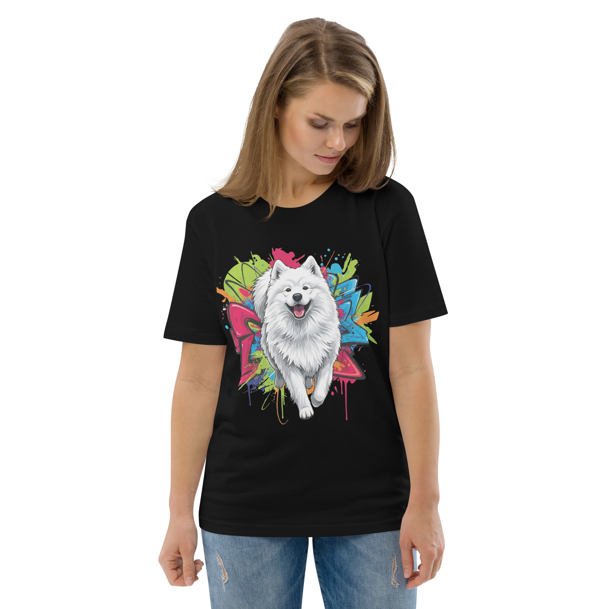 Conocido por su "sonrisa de Samoyedo", esta raza nórdica es un ejemplo de gentileza, inteligencia y compañerismo. Son perros llenos de energía y afecto, que disfrutan enormemente de la compañía de su familia y son famosos por su hermoso pelaje blanco y esponjoso. Esta camiseta captura esa alegría contagiosa, convirtiéndola en un tributo perfecto a tu fiel compañero.