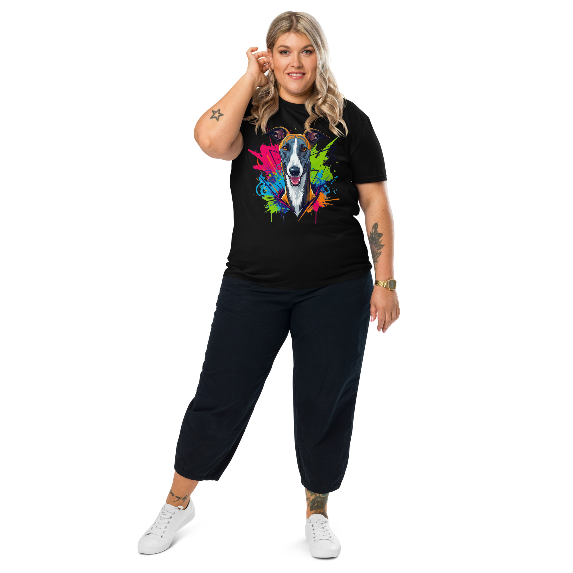 Celebra la conexión inquebrantable con tu mejor amigo de cuatro patas. Esta camiseta de algodón orgánico es más que una prenda, es un homenaje a la gracia, la velocidad y la tranquilidad de la raza Galgo.
