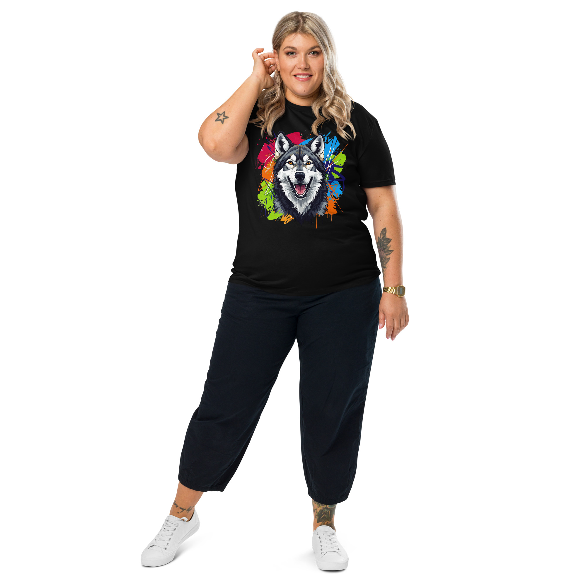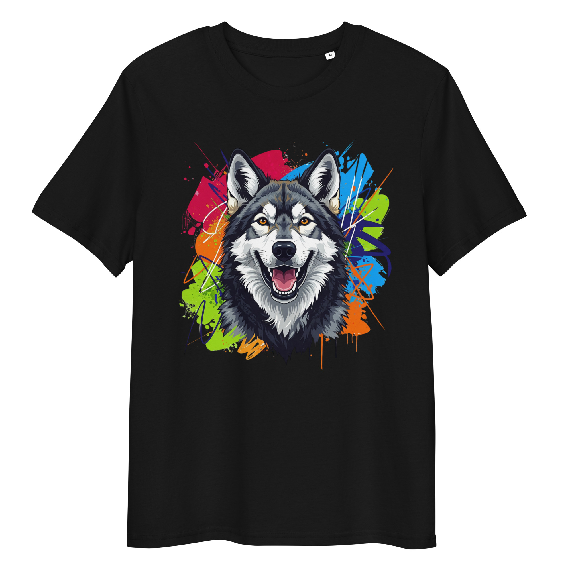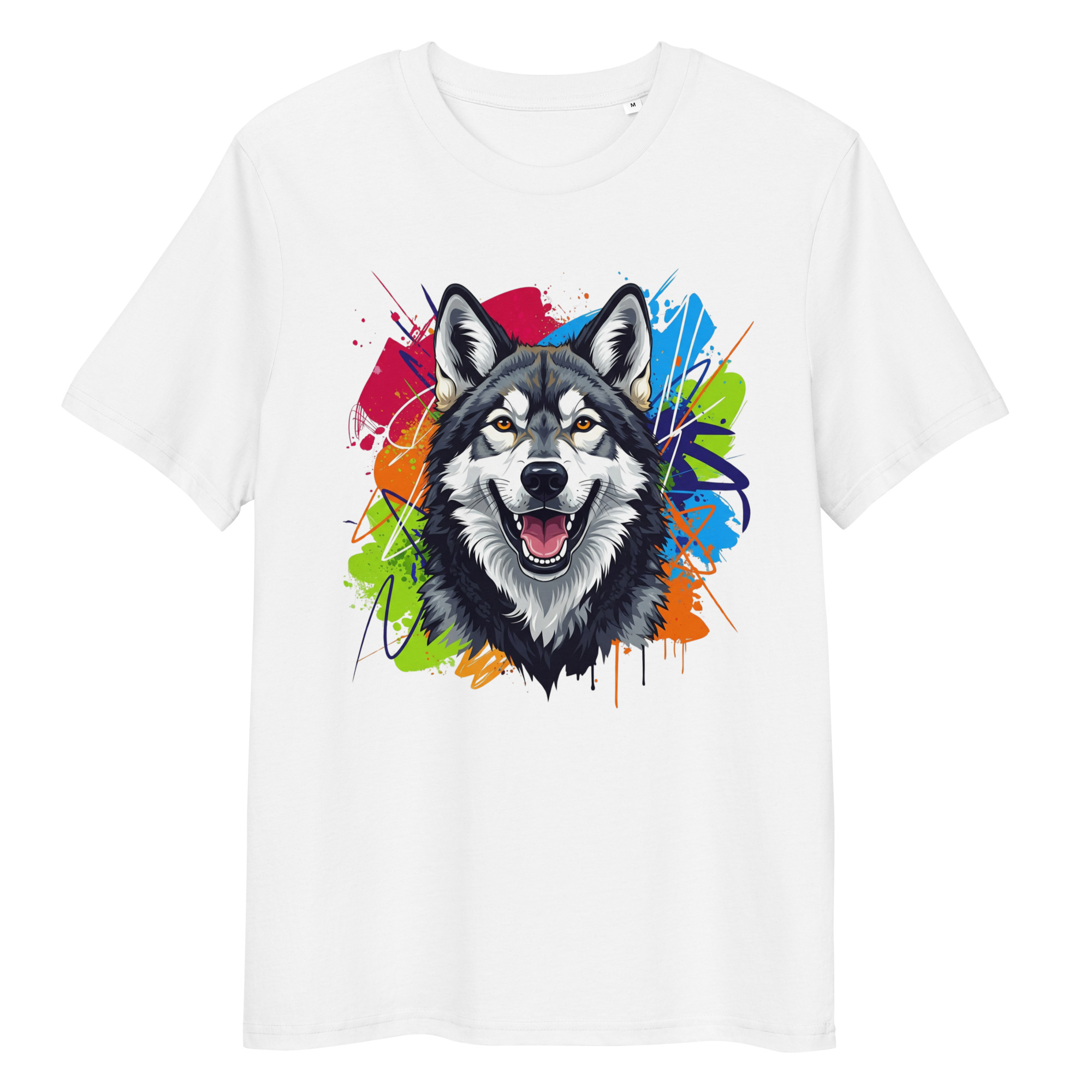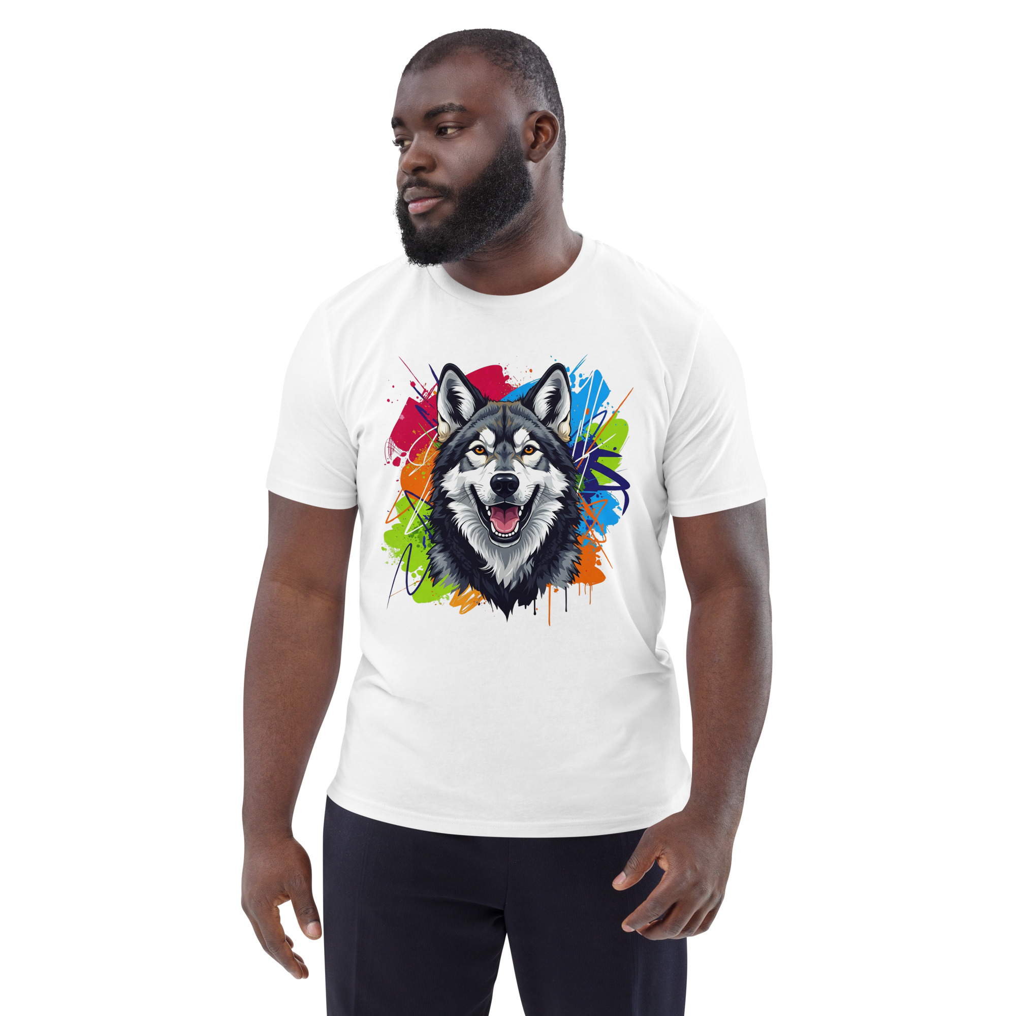 Camiseta unisex de algodón orgánico con un diseño exclusivo de Perro Lobo. Esta prenda de calidad premium es perfecta para quienes admiran a esta noble raza y valoran la moda sostenible.