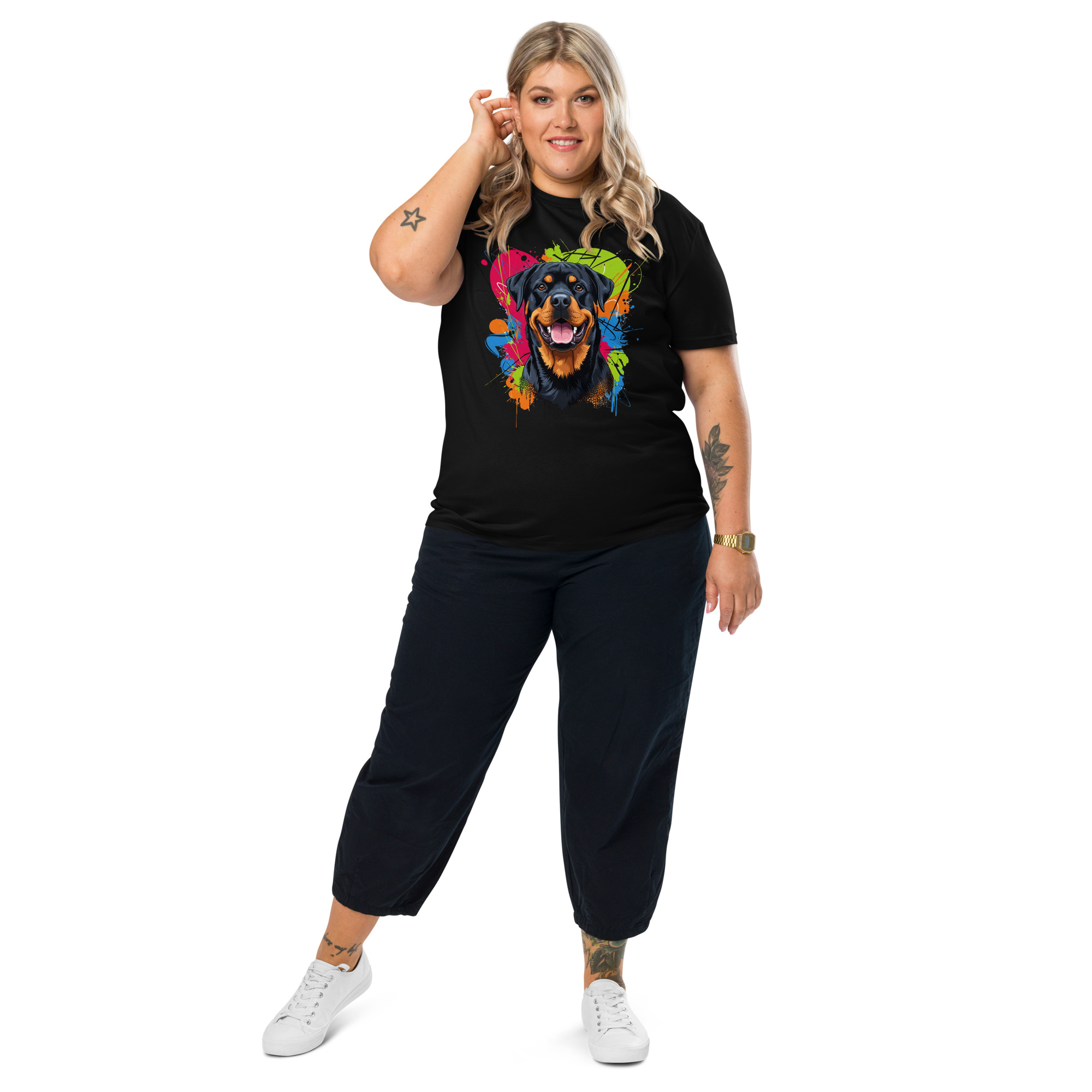 Su corte unisex garantiza un ajuste cómodo para todos, mientras que el diseño exclusivo del Rottweiler, generado con inteligencia artificial, la convierte en una pieza de arte única.