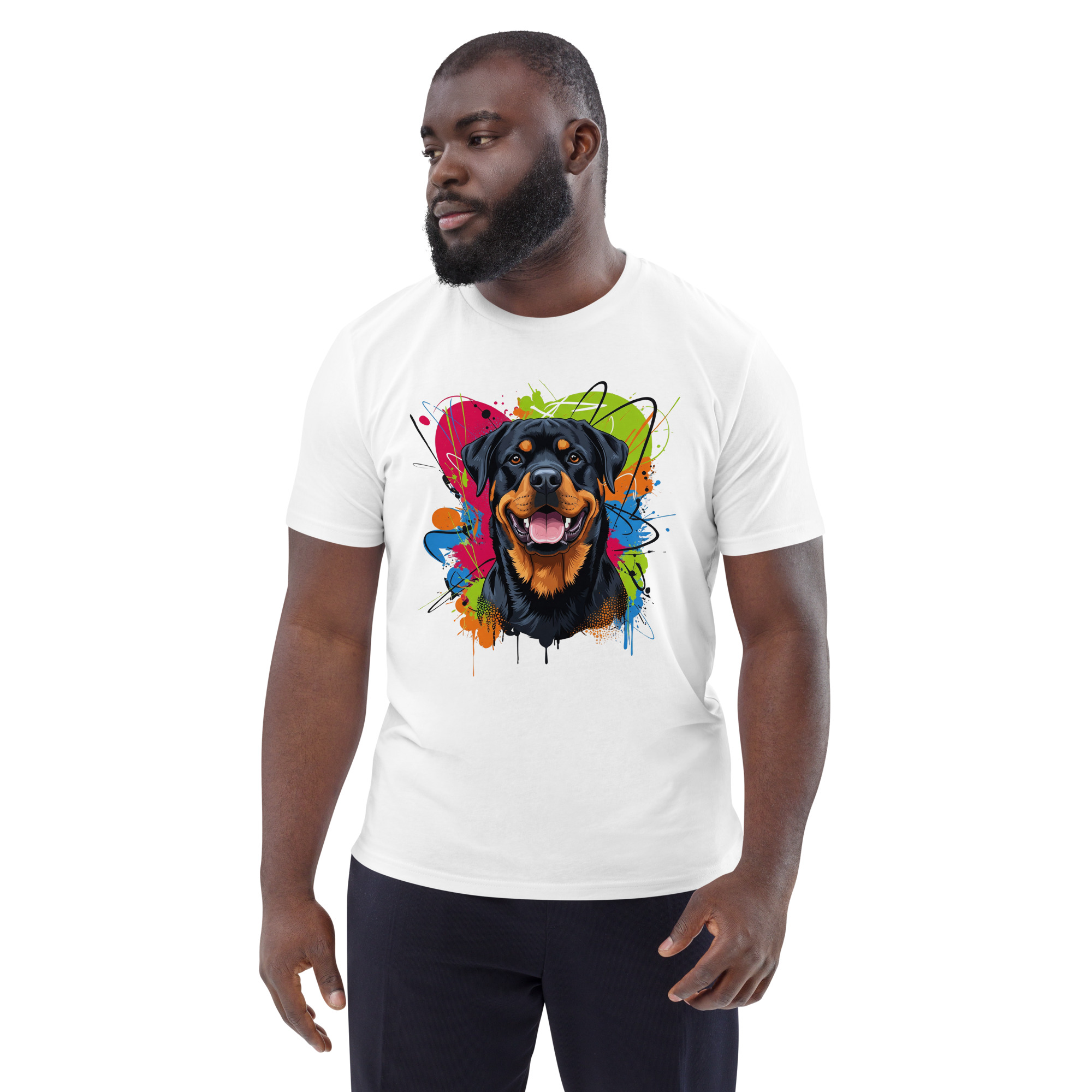 Camiseta unisex de algodón orgánico con un diseño exclusivo de Rottweiler. Capturando su porte majestuoso y su mirada confiada, esta prenda es perfecta para quienes admiran a esta noble raza y valoran la moda sostenible.