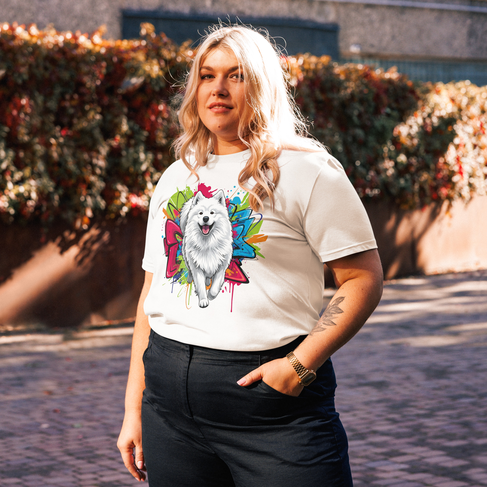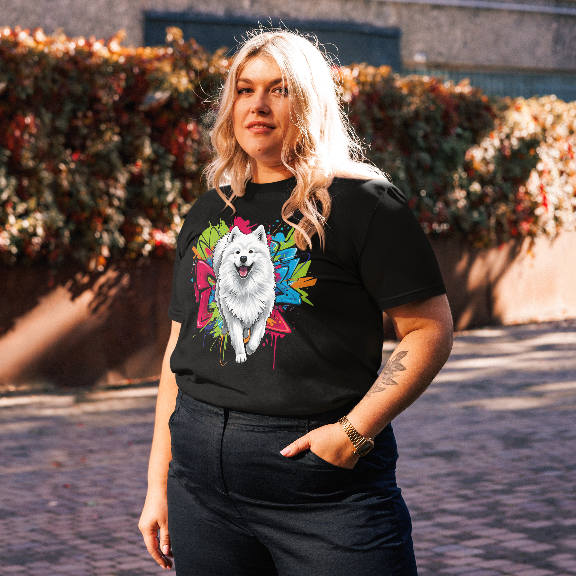 El diseño exclusivo de Samoyedo, creado con inteligencia artificial, captura la majestuosidad de esta raza en un estilo moderno y artístico.